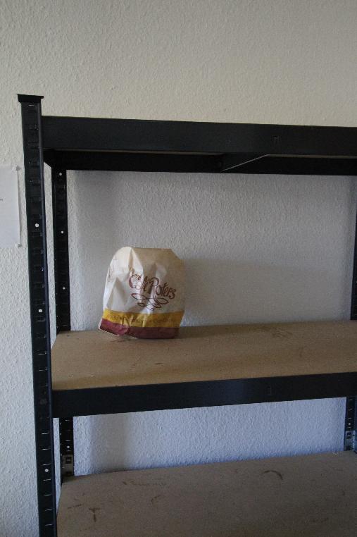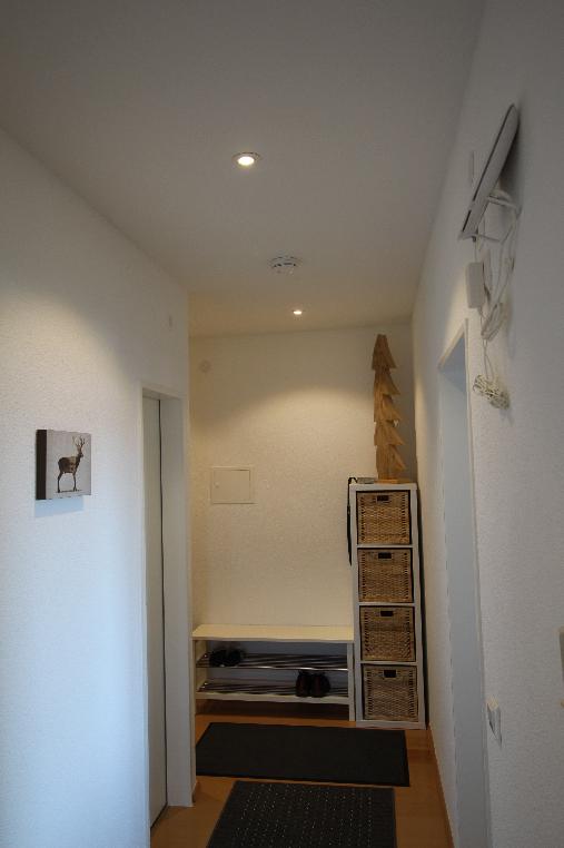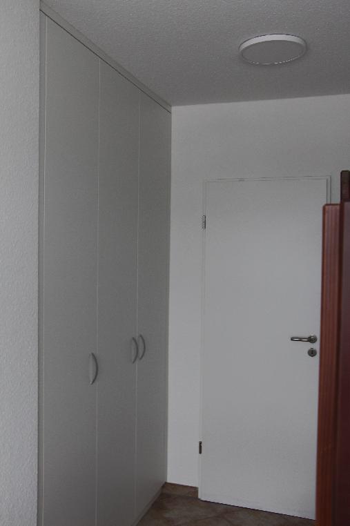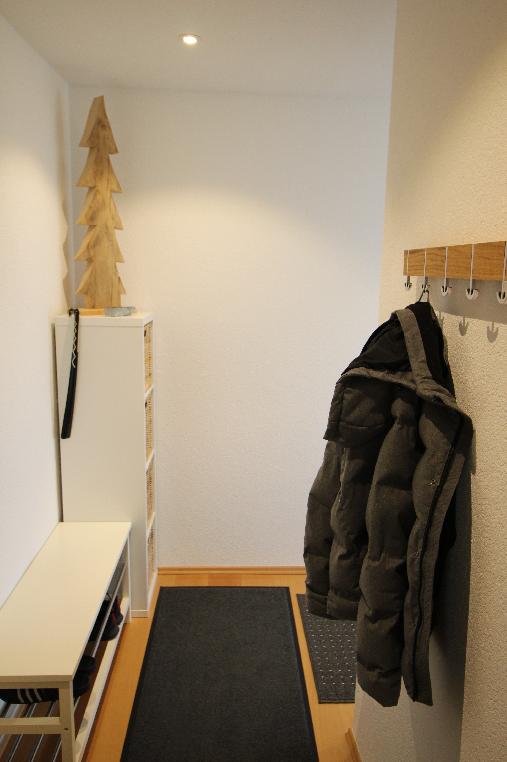 Flur: Garderobe, Schuhregal, Regal mit Aufbewahrungskörben und Einbauschrank (mit Wäscheständer, Staubsauger, Besen, Kehrschaufel, Bodenwischer, Bügeleisen und Bügelbrett).