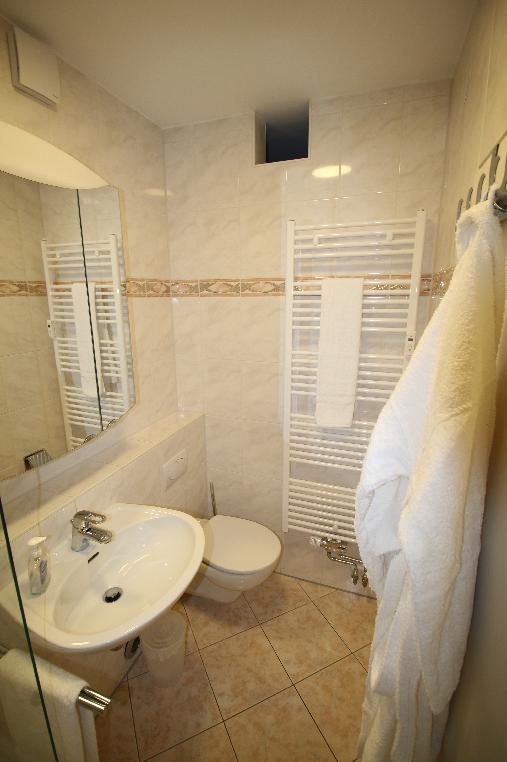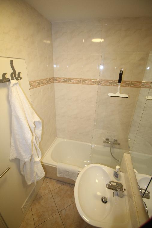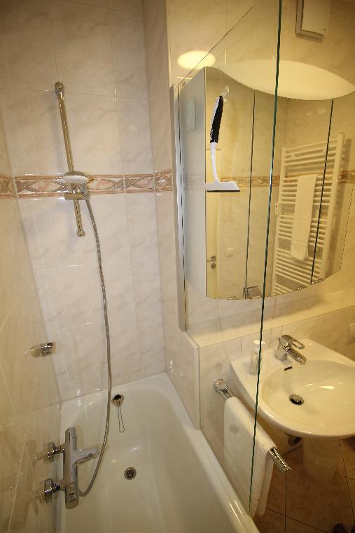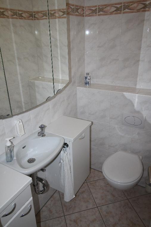 Zwei Bäder: beide Bäder mit Toilette, Waschbecken, Spiegelschrank und Schließolive; ein Bad hat eine Bade-/Duschwanne, eine Aufhängemöglichkeit für Bademäntel und einen Handtuchwärmer. Im kleineren Bad befindet sich ein Fön.