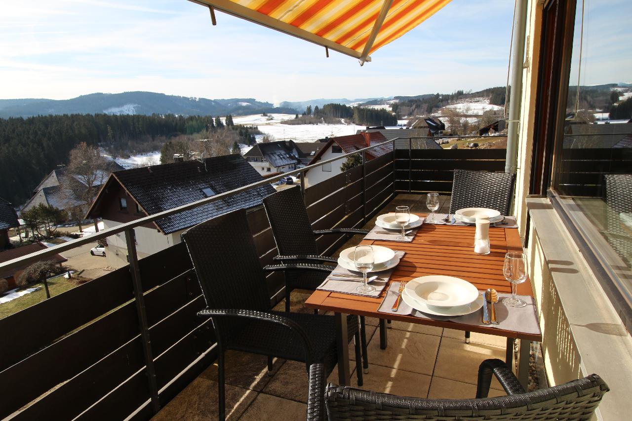 Balkon: großer umlaufender Südwestbalkon mit Tisch, 6 Stühlen und zwei Markisen.